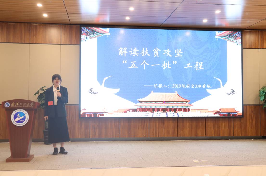 获得二等奖的第三组选手是来自资源与安全工程学院的黄敏,她演讲的主题是“解读扶贫攻坚“五个一批”工程”。她指出,五个一批工程基本涵盖了各类贫困人口,是党对于贫困人口绝不落下一户的坚定承诺,是党在实践中总结出来的生动经验。