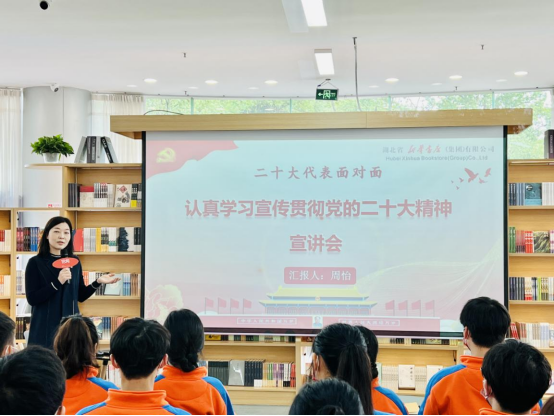 本网讯(通讯员 范玉璟)为深入学习宣传贯彻党的二十大精神,将“热气腾腾”的二十大精神送到师生心间,11月16日上午,党的二十大代表、全国劳动模范、中国书店年度阅读推广人、湖北省新华书店(集团)有限公司武汉市分公司党支部书记、经理周怡应邀来到尊龙凯时人生就是博图书馆倍阅·微特书店宣讲党的二十大精神。学工部部长吕容涛、校团委书记严敏、宣传部副部长赵小硕、研工部副部长陈朝娟、图书馆副馆长叶仙娥,学校许志伟党员示范班学员、青马班学员、研究生党员代表参加了宣讲会。图书馆馆长杨述斌主持宣讲会。