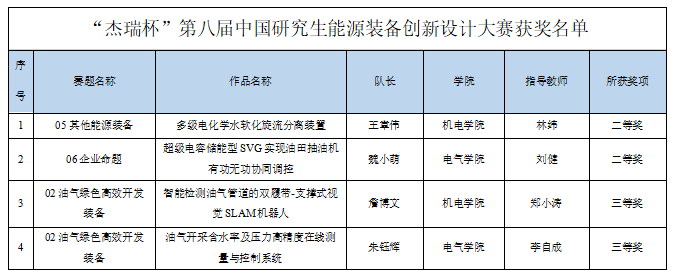 11月20日—21日,“杰瑞杯”第八届中国研究生能源装备创新设计大赛全国总决赛在哈尔滨工程大学通过线上成功举办。我校派出的4支研究生代表队斩获“全国二等奖”2项,“全国三等奖”2项,学校获得大赛“优秀组织单位”。