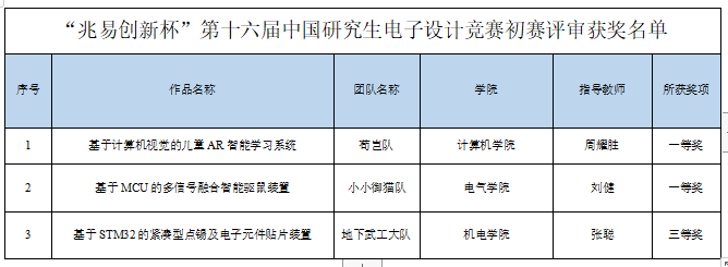 近日,“兆易创新杯”第十六届中国研究生电子设计竞赛华中赛区评审会在中南大学举行。华中地区来自武汉大学、华中科技大学、湖南大学、国防科技大学、中南大学等42所高校的551支参赛队伍报名参加,参与研究生1653人。经过专家组对参赛作品的技术文档和演示视频进行了会议评审,109支队伍从中脱颖而出,进入现场比赛。我校3支队伍斩获“华中赛区一等奖”2项,“华中赛区三等奖”1项。