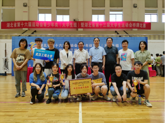 李志旭、江本武、范东芳、张庆、乐建军分别为获奖学校和个人颁发奖杯、奖牌和证书并合影留念。最后,李志旭宣布湖北省第十六届运动会青少年体育类(大学生组)暨湖北省第十三届大学生运动会桥牌比赛闭幕。(审稿 江本武)