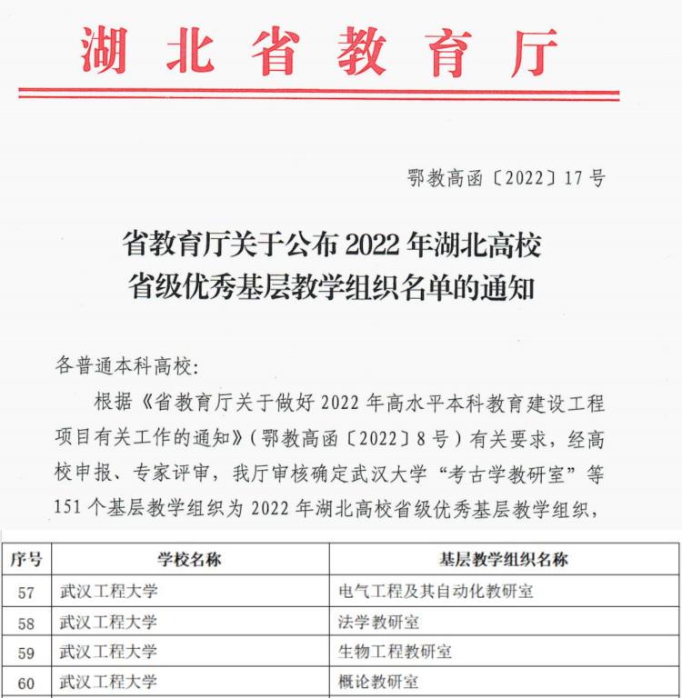本网讯(通讯员 延飞)近日,湖北省教育厅发布了《省教育厅关于公布2022年湖北高校省级优秀基层教学组织名单的通知》(鄂教高函﹝2022﹞17号),我校电气工程及其自动化教研室、法学教研室、生物工程教研室、概论教研室获批2022年湖北高校省级优秀基层教学组织。