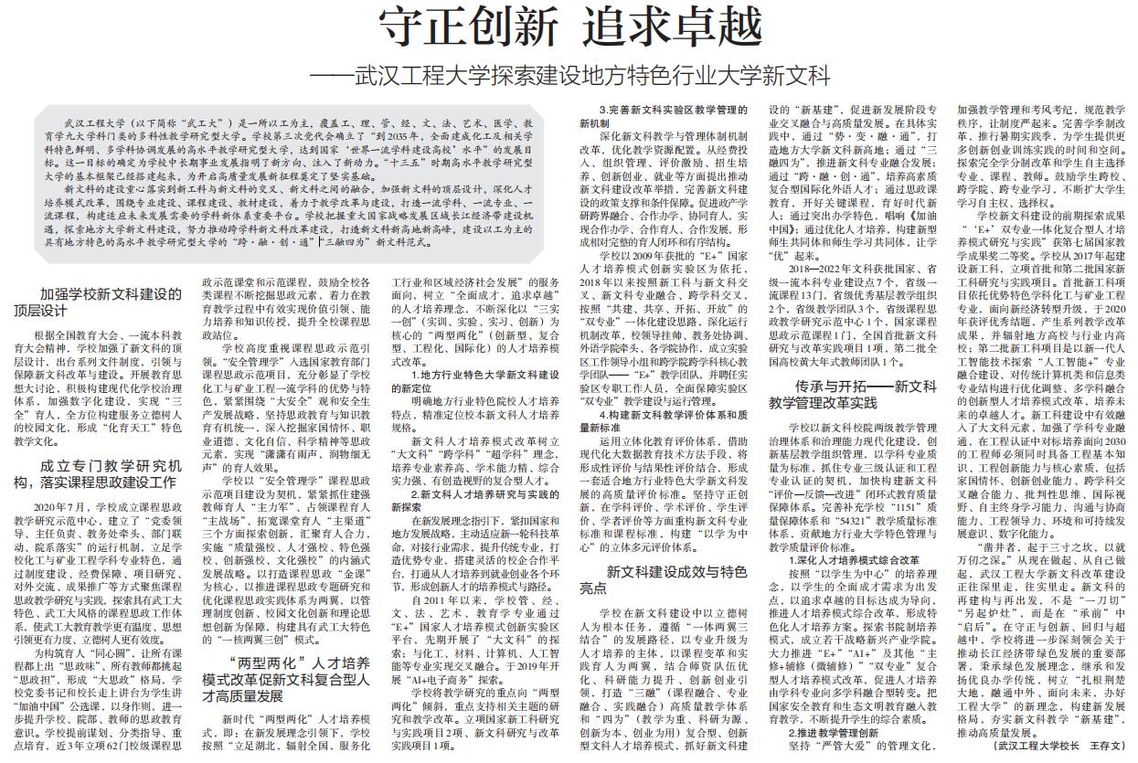新文科的建设重心落实到新工科与新文科的交叉、新文科之间的融合,加强新文科的顶层设计,深化人才培养模式改革,围绕专业建设、课程建设、教材建设,着力于教学改革与建设,打造一流学科、一流专业、一流课程,构建适应未来发展需要的学科新体系重要平台。学校把握重大国家战略发展区域长江经济带建设机遇,探索地方大学新文科建设,努力推动跨学科新文科改革建设,打造新文科新高地新高峰,建设以工为主的具有地方特色的高水平教学研究型大学的“跨·融·创·通”“三融四为”新文科范式。