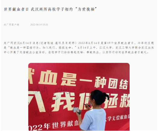 据悉,此次活动正值世界献血者日,央广网第一时间聚焦并报到我学子献血义举,点赞我校百“化”林志愿者积极“为爱挽袖”,为武汉市血液事业作出了贡献,弘扬志愿服务精神,凝聚文明向善力量。(审稿 严敏)