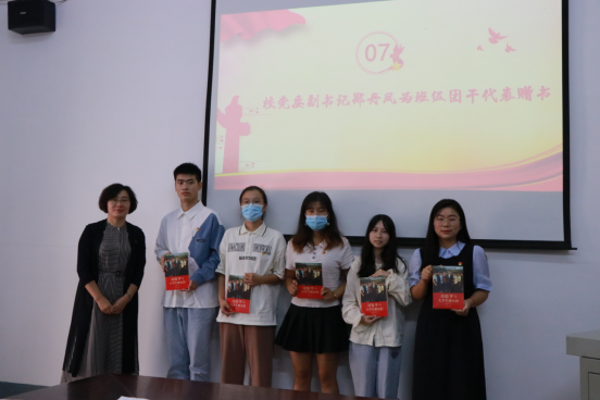 回顾历史记忆,深情礼赞建党百年。化工与制药学院、法商学院、外语学院、化学与环境工程学院、环境生态与生物学院、管理学院等学院以回顾党的历史为主线,开展了“喜迎党的二十大,强国复兴有我在”、“弘扬爱国精神,勇担时代使命”、“十年青春,百年梦想”主题班会,通过集中观看党史视频、讲述党史故事、红歌传唱、红色故事分享、话剧表演、诗歌朗诵等方式带领学生重温建党建国、改革开放的伟大历程,帮助学生加强对“四史”知识的了解,重温红色岁月,将红色基因厚植于青年学子心间,深化学生爱党、爱国、爱校情怀。学校党委副书记郑丹凤参加了法商学院2020级法学2班的主题班会,为班级学生代表赠送《习近平与大学生朋友们》书籍,她勉励同学们要心系祖国,心怀感恩。