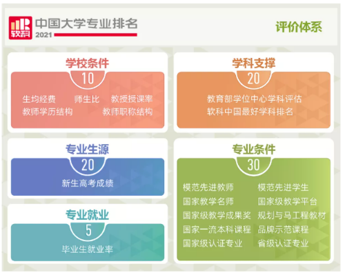 据悉“软科中国大学专业排名”于2021年首次发布,“软科中国大学专业排名”是迄今为止覆盖专业数量最多、参评专业规模最大的中国大学本科专业排名。“软科中国大学专业排名”设计了独具特色的专业竞争力评价框架,通过学校——学科——专业三个层次的评价汇总形成对专业的综合评价。排名指标体系设置学校条件、学科支撑、专业生源、专业就业、专业条件5个指标类别,共19项测量指标。“学校条件”考察一所大学的经费收入、师资规模、师资结构、教授授课等学校层面的培养条件,结果用于学校开设的所有专业;“学科支撑”考察专业关联学科的水平和实力,一个学科对与其关联密切的专业均有支撑作用;“专业生源”即专业录取新生的高考成绩,反映了该专业的社会声誉和对学生的吸引力;“专业就业”体现了专业的毕业生被社会认可和接纳的情况;“专业条件”考察本专业的平台、名师、课程、教材等专业层面的培养条件以及本专业获得的各种认证和重点建设情况。