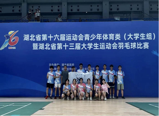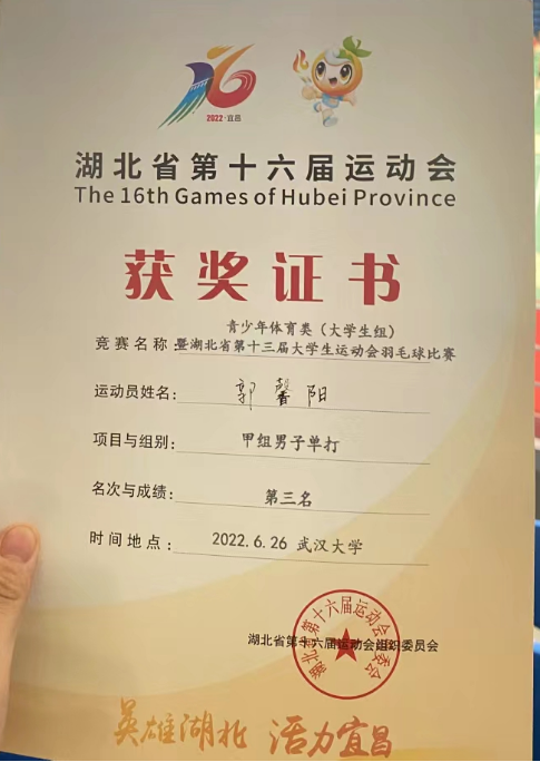 本网讯(通讯员 魏四成)6月26日,由湖北省人民政府主办,湖北省教育厅、湖北省体育局承办,湖北省大学生体育协会、武汉大学协办的湖北省第十六届运动会青少年体育类(大学生组)暨湖北省第十三届大学生运动会羽毛球比赛在武汉大学落下帷幕。我校学子郭馨阳在男单比赛中斩获第三名,张蕴月在女单比赛中获得第八名,王艺泽和郭馨阳获得体育道德风尚奖。