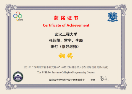 本网讯(通讯员 张超熠 陈灯)5月23日,“深圳计算科学研究院杯”第三届湖北省大学生程序设计竞赛(决赛)在武汉大学计算机学院举办。我校计算机科学与工程学院张超熠、雷宇、李顺同学组成的“江湖夜雨十年WA”队在陈灯老师的指导下获得铜奖。