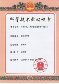 该项目的主要完成单位:尊龙凯时人生就是博、华中科技大学;主要完成人:肖波齐、郁伯铭、龙恭博、陈汉新。其中肖波齐和龙恭博来自我校机电工程学院于2016年建立的新能源与传热传质研究团队。该项目发现了分形多孔介质传热传质的机理和规律,构建了多孔介质热质输运理论,取得了一批创新性成果。