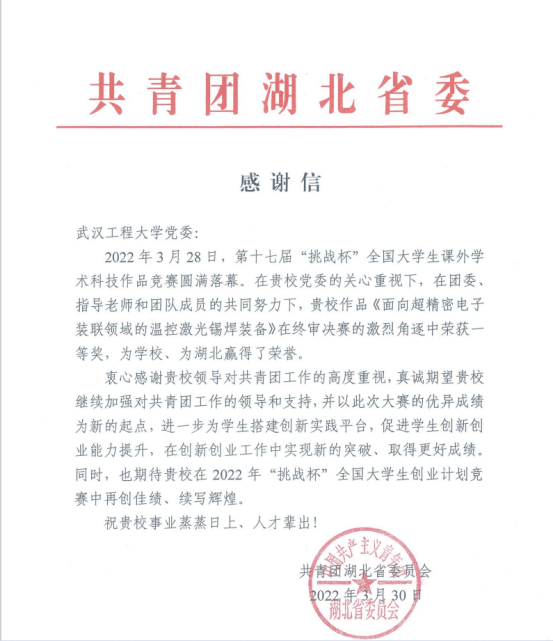 国赛结束后,共青团湖北省委就我校挑战杯取得的优异成绩发来了感谢信。