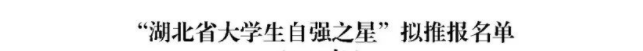 经高校申报、材料审核、宣传展示、专家评审等环节,拟推报湖北省“大学生自强之星标兵”10名、湖北省“大学生自强之星”100名,并拟从中择优等额推报71名学生参加“中国大学生自强之星”评选(含1名“中国大学生自强之星标兵”),其中我校鄂哲恒、张靖宇两名同学入选湖北省“大学生自强之星”,并被等额推报参加“中国大学生自强之星”评选。