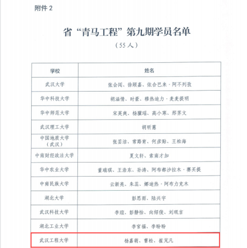 本网讯(通讯员 曹予菡)近日,共青团湖北省委公布了湖北省第九期青年马克思主义者培养工程名单。我校机电工程学院机械电子工程专业2020级学生杨嘉萌、法商学院法学专业2020级学生崔芃凡、马克思主义学院马克思主义中国化研究方向2021级研究生曹松等三名学生成功入选。