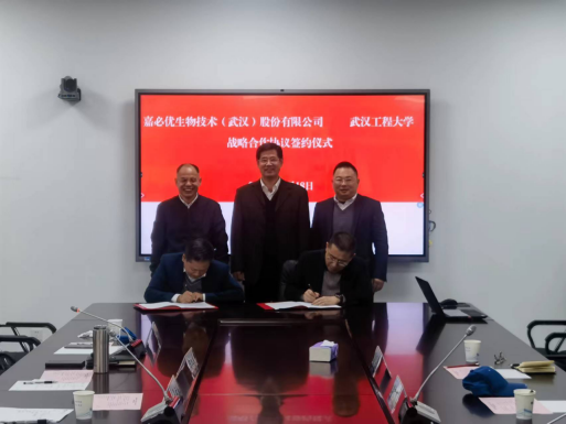 本网讯(通讯员 郭洪伟)11月18日上午,学校与嘉必优生物技术(武汉)股份有限公司战略合作协议签约仪式在教育教学综合楼829会议室举行。校长王存文、校党委常委吴云韬,嘉必优公司董事长易德伟、执行总经理李翔宇、总工程师汪志明、研发总监陆姝欢及资深工程师马凡提参加签约仪式。签约仪式由科学技术发展院院长陈旭勇主持。