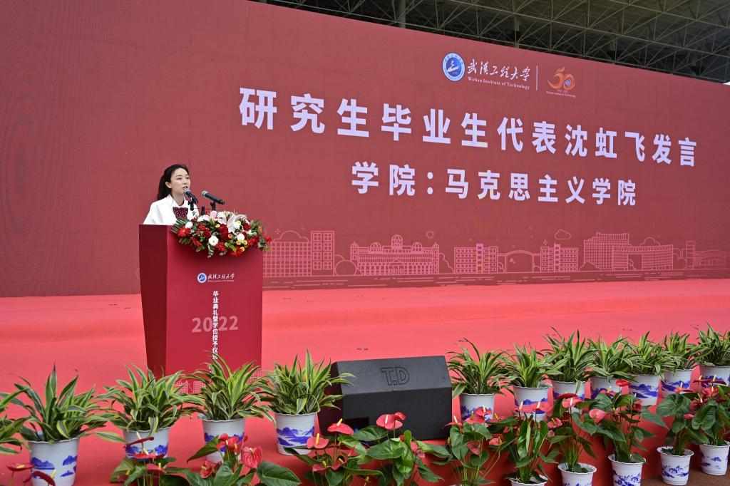 毕业生代表沈虹飞回首在工大求学的三年:我们经历了疫情大考,见证了完美的“工大答卷”,见证了优秀的“中国答卷”。我们以勇气克服恐惧,以奋斗战胜躺平,给自己交出了满意的“求学答卷”。