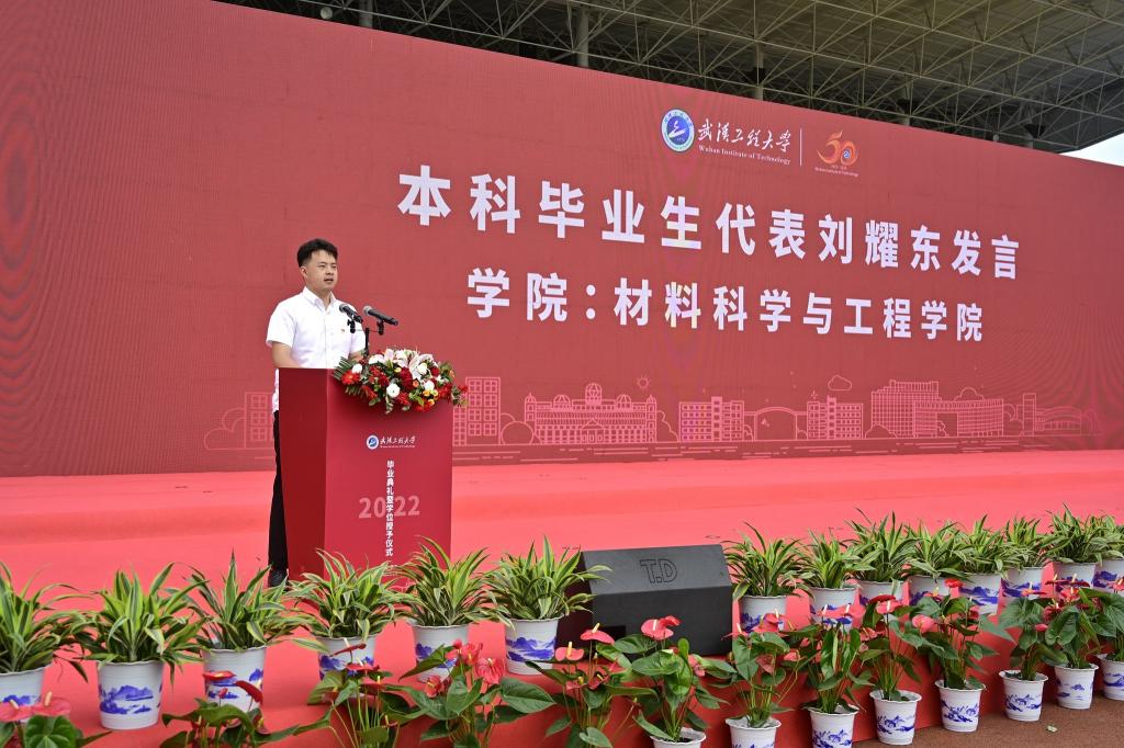毕业生代表刘耀东用怀“格物”之心,探索万物奥秘;做“明理”之人,通达心灵远方;持“致知”之念,攀登科学高峰;务“笃行”之实,谱写青春华章,这四句话与毕业生共勉。