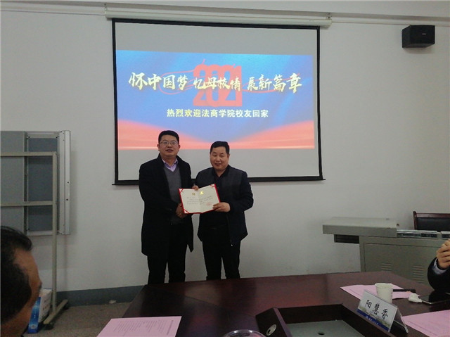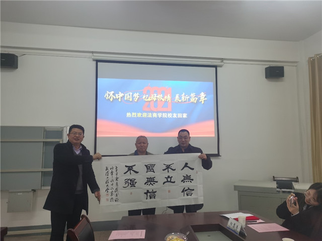 会上,金明浩代表法商学院致欢迎辞,向与会校友代表详细介绍了法商学院的院史院情。他表示,广大校友是学校最宝贵的财富,校友的力量是母校建设发展的坚强基石,感谢校友长期以来对母校和法商学院的关心和帮助,衷心希望校友们常回家看看,并一如既往地支持学校和学院的发展,为学院的建设出谋划策,学院将把校友们的真知灼见转化为推动学院更好发展的动力。随后,院长金明浩为校友代表颁发校外创新创业导师聘书并赠送学院定制纪念品。经济学教研室刘有源教授现场泼墨挥毫向与会校友赠送书法作品。