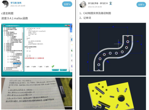 寒假不停学,学习“云打卡”。参与学习类型打卡的同学们通过学习乐器、学会烹饪、学习专业相关的软件等等来不断升华自己。有的同学已经提前进入到本专业相关软件的学习,如CAD、solidworks、C语言等,为即将到来的专业学习打下一个基础。