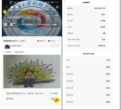 系列活动分为阅读、学习、推介、实践四大类,在学院精心协调组织下,各年级班级细化到以宿舍为单位,形成了“班委督促打卡、寝室长带头参与,班主任全程监督,辅导员全程参与”的网格化学习管理制度,活动第一周就有近300名机电学子参与进来。随着宣传力度的不断加大,活动人数还在保持上升趋势。参与到活动中的同学通过文字、照片、视频等方式在打卡小程序中进行每日打卡,并交流打卡心得,极大地丰富了同学们的假期生活,并充分展现出机电学子于疫情在家期间学习的主动性与积极性。