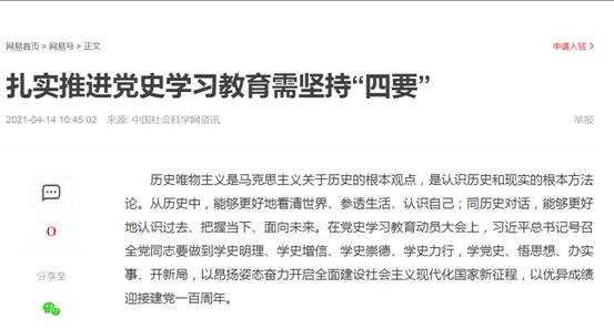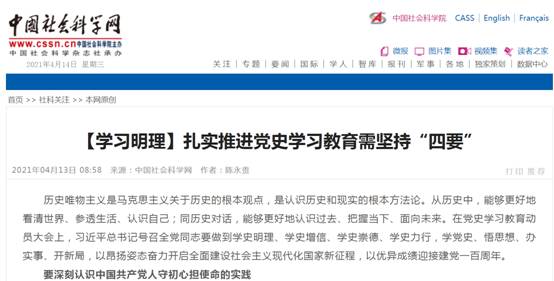 本网讯(通讯员 金诗灿)中共中央决定开展党史学习教育主题活动以来,我校马克思主义学院迅速响应党中央号召,按照学校部署,积极组织教师开展党史学习教育专题活动,组织教师撰写文章,深入研究党史及如何开展党史教育,在《中国社会科学网》等多家主流网站发表文章。操菊华教授撰写了《传承百年红色基因必须抓好青年党史教育》(http://ex.cssn.cn/zx/bwyc/202103/t20210308_5316182.shtml),陈永贵博士撰写了《扎实推进党史学习教育需坚持“四要”》(http://ex.cssn.cn/zx/bwyc/202104/t20210413_5325923.shtml)。文章发表后,被搜狐、网易、中国历史研究网及今日头条等客户端转发,产生了积极影响。