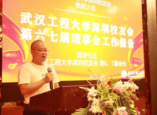 莫荣代表第六、七届理事会做工作报告。他全面回顾了两届任期以来深圳校友会在扶持校友、服务社会、校企合作和回馈母校等方面的主要工作,对大力支持深圳校友会发展的母校领导表示衷心感谢,希望新的校友会班子在校友总会支持和关心下,传承深圳校友会精神,在新形势下将深圳校友会发展得更好。