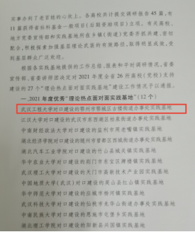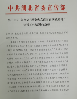 本网讯(通讯员 王威)日前,中共湖北省委宣传部通报了2021年全省“理论热点面对面实践基地”(原“理论热点面对面示范点”)建设工作情况,我校对口建设的鄂州市鄂城区古楼街道“理论热点面对面实践基地”蝉联优秀实践基地,在12个优秀基地中名列第一。