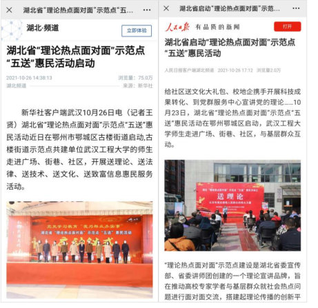 2021年10月,我校在实践基地成功举办全省“五送”惠民活动首发仪式。惠民活动受到当地群众热烈欢迎,被人民日报、新华社、湖北日报和湖北电视台等主流媒体广泛关注和报道。