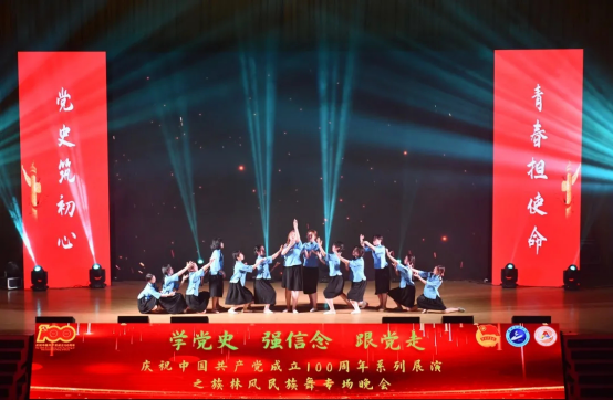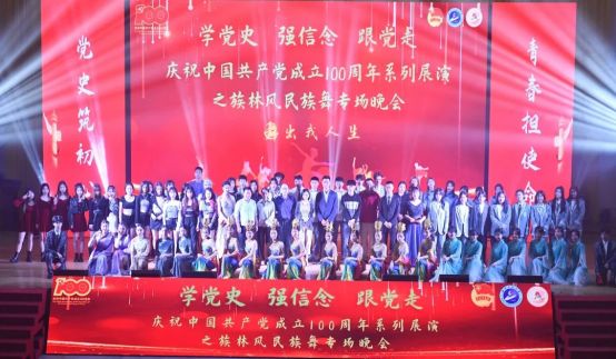 本网讯(通讯员 张钟文)为庆祝建党100周年,丰富学生的课余生活,进一步推动校园文化建设,营造良好的艺术氛围,5月7日晚,学校庆祝中国共产党成立100周年系列展演之族林风民族舞专场晚会在流芳校区大礼堂成功举行。