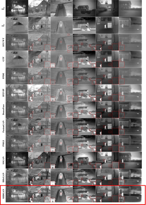 图像融合是一种图像增强技术,旨在将不同类型传感器采集的图像相结合,生成一张信息量更丰富的图像,从而促进后续高层的处理和决策,是计算机视觉领域的研究热点。如何提高融合图像的高层语义表达能力,仍然是一个具有挑战性的难题。受到经典基于生成对抗网络技术的启发,该论文提出了基于语义监督及双鉴别器生成对抗网络的红外与可见光图像融合算法。论文通过标注语义的监督,使得生成器学会了不同语义目标的融合机理,可以在保留源图像模态特征的同时提高融合图像的语义一致性。此外,区别于传统的生成对抗网络,论文中的双鉴别器分别用于识别红外与可见光图像的分布,然后作用于融合图像中特定模态(红外/可见光)的语义目标,以保持和增强它们的模态特征。实验结果表明,该方法优于前沿最优算法。图1展示了该论文的算法框架。图2展示了论文算法和前沿算法定性的对比实验结果。