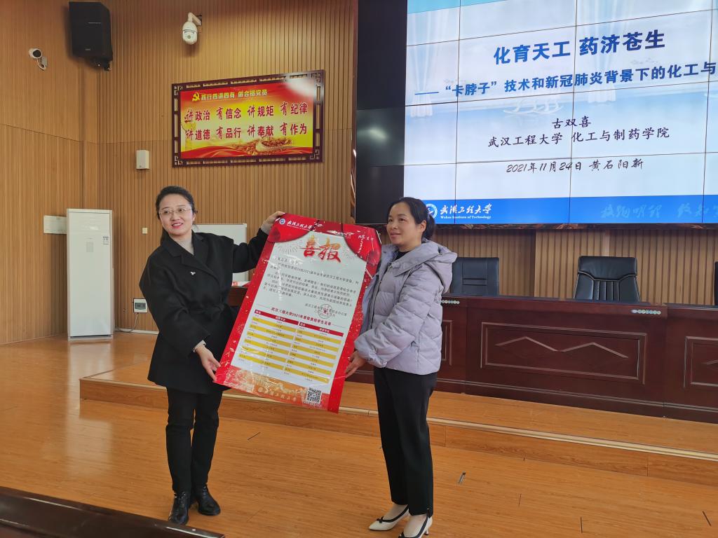 11月24日下午,化工与制药学院古双喜教授赴阳新县第一中学开展了题为《化育天工、药济苍生——“卡脖子”技术和新冠肺炎背景下的化工与制药人》的科普讲座,古教授深入浅出地讲述了化工与制药相关领域的最新进展和发展前景,并鼓励同学们选择尊龙凯时人生就是博,成就精彩人生。