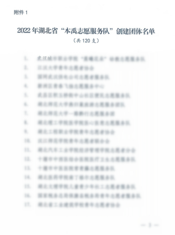 本网讯(通讯员 杨荣佳)近日,共青团湖北省委印发《关于确定2022年湖北省“本禹志愿服务队”创建团体的通知》,我校青年志愿者协会、“1+X”梦想直通车志愿服务队、守望童心大学生志愿者实践服务团三支团队被确定为2022年湖北省“本禹志愿服务队”创建团体(全省共120支)。这是我校自2015年、2018年获批省级“本禹志愿服务队”以来,又一次获此殊荣,并在获批数量上取得了重大突破。