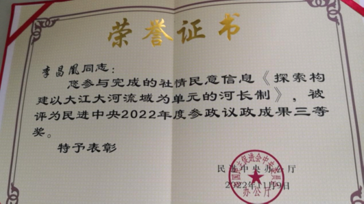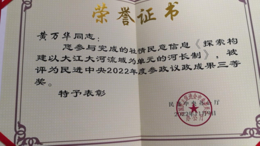 校民进会员黄万华和李昌凰共同完成的《探索构建以大江大河流域为单元的河长制》社情民意信息被评为民进中央2022年度参政议政成果三等奖。