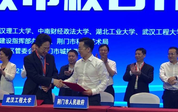 副校长张彦铎与荆门市副市长门金勇签订了《战略合作框架协议》;副校长张彦铎与荆门市副市长李文震签订了《共建化工新材料产业技术研究院协议》。