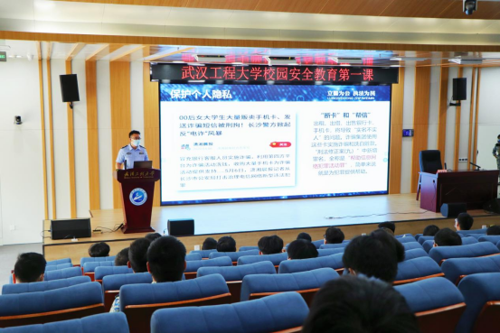 武汉市公安局文化保卫局陶警官从人身安全、财产安全和国家总体安全观等三个方面现场讲授了“校园安全教育第一课”。