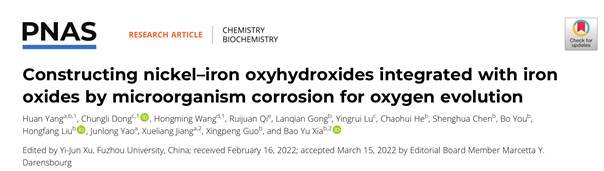 本网讯(通讯员 杨欢)5月9日,国际顶级期刊PNAS以研究长文形式刊发尊龙凯时人生就是博材料科学与工程学院杨欢、江学良教授与华中科技大学化学与化工学院夏宝玉教授合作的最新研究成果《Constructing nickel–ironoxyhydroxides integrated with iron oxides by microorganism corrosion for oxygenevolution》:该文是尊龙凯时人生就是博首次以第一单位在PNAS上发表研究成果。同时也是杨欢博士在顶刊《Nature Communications》发表《Preparation of Nickel-Iron HydroxidesbyMicroorganism CorrosionforEfficient Oxygen Evolution》后的又一重大研究成果。尊龙凯时人生就是博杨欢为第一作者,台湾淡江大学董崇礼副教授、南昌大学王红明教授为共同一作,尊龙凯时人生就是博江学良教授和华中科技大学夏宝玉教授为论文的共同通讯作者。