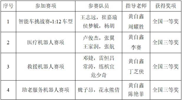 我校参赛赛项《智能车(1:12车型)》模拟实际无人驾驶场景控制车辆稳定、快速的行驶,获得全国一等奖;参赛赛项《医疗服务机器人》协助医生完成远程查房巡诊、送药任务;《助老服务机器人》结合机器人技术与智能家居技术保障老年人居家生活质量;《救援机器人》融合多种信息技术,实现未知环境中的自主探索与救援任务,均获得三等奖。