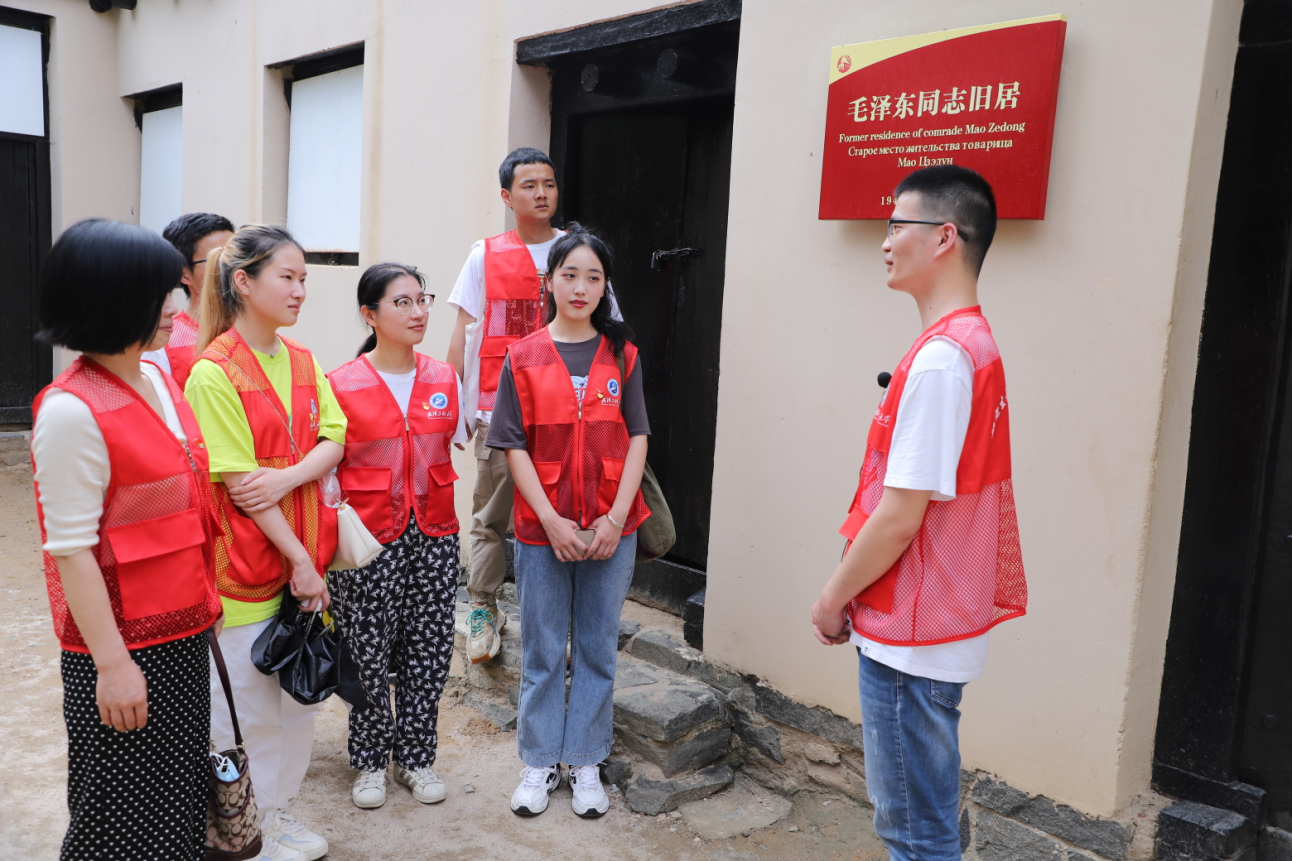 实践团成员熊志国、钱依婷和周良志实地讲解毛泽东旧居、中共七届二中全会旧址及西柏坡纪念馆相关党史故事。