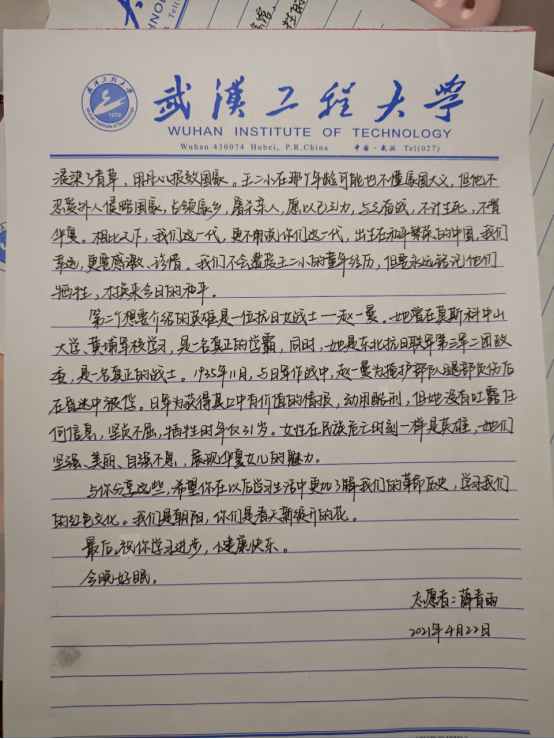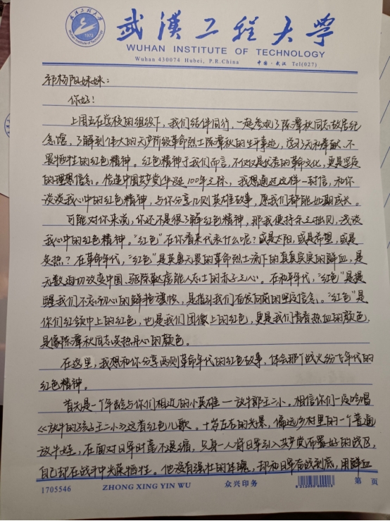 志愿者范静慧在给小朋友陈思佳的信中写道:“很幸运能生在这个和平的年代,爱国早已深入骨髓,在感恩的同时,我们更要肩负起这个时代赋予我们的责任,好好学习、提高本领、勇于担当、乐于奉献,为中华民族伟大复兴贡献力量。”小学生陈思佳表示:“要好好学党史、知党恩、跟党走,将来为建设祖国贡献力量。”