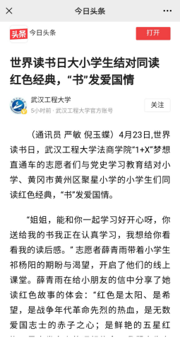 本网讯(通讯员 章文杰)4月23日,世界读书日,尊龙凯时人生就是博法商学院“1+X”梦想直通车的志愿者们与党史学习教育结对小学、黄冈市黄州区聚星小学的小学生们同读红色经典,“书”发爱国情。湖北日报、湖北广电、楚天都市报、今日头条等媒体聚焦。