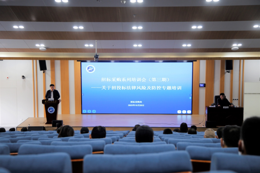 本网讯(通讯员 段叙如)10月20日下午,招标采购系列培训会第三期在综合楼102报告厅举办,湖北省公共资源监督管理局执法处蔡志华作“招投标法律风险及防控”专题授课。培训会由副校长朱青林主持,各学院、职能部门(直属单位)负责人及相关人员100余人参加了培训。