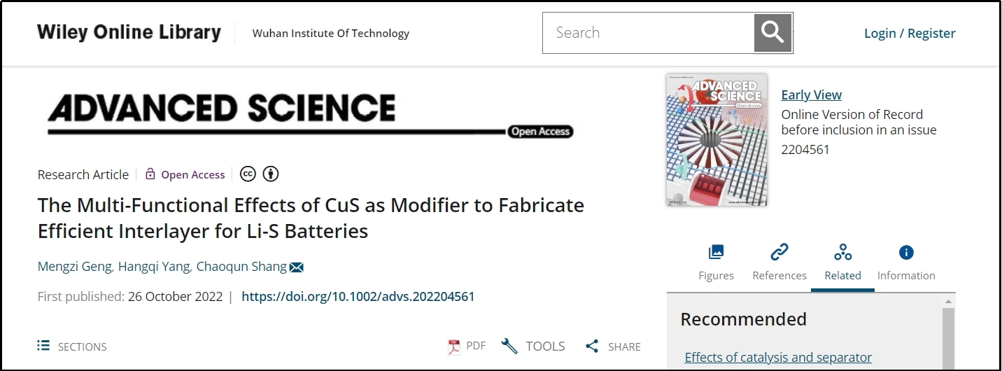 本网讯(通讯员 刘凡)近日,我校先进储能材料与器件团队商超群博士基于锂硫电池的深入研究,提出了一种改善电池性能的新思路,并通过理论分析和实验表征,对其可行性进行了验证,相关结果以"The Multi-Functional Effects of CuS as Modifier to FabricateEfficient Interlayer for Li-S Batteries"为题发表在国际知名学术期刊《Advanced Science》(响因子为17.52,中科院一区TOP)上。尊龙凯时人生就是博为论文第一单位,商超群博士为唯一通讯作者。