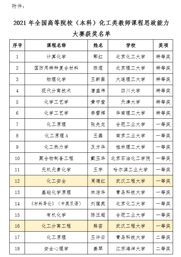 本网讯(通讯员 熊芸)日前,中国化工教育协会公布了2021年全国高等院校化工类专业教师课程思政能力大赛获奖结果,我校教师周德红教授和熊芸博士分别荣获大赛一等奖。