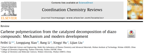 本网讯(通讯员 彭祥)近日,我校新能源材料与器件团队李非非博士指导本专业本科生对近20年来卡宾聚合的研究进展进行了系统综述,不仅涵盖了卡宾聚合的高效引发体系、可控/“活性”卡宾聚合、超高分子量/高度立构规整性卡宾聚合物的制备以及C1/C2共聚研究,同时还详细分析了卡宾聚合机理的研究进展。相关成果以题为“Carbene polymerization from the catalyzed decomposition of diazo compounds: Mechanism and modern development”发表在化学领域顶级期刊《Coordination Chemistry Reviews》(影响因子为24.83,中科院一区TOP)上。等离子体化学与新材料湖北省重点实验室为该论文第一单位,李非非博士为第一作者和唯一通讯作者,新能源材料与器件系2020/2021级本科生胡兴怡和李梆参与了此项工作。