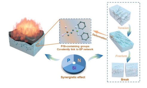 针对环氧-脂肪胺体系在涂料、复合材料等领域中的火灾安全以及脆性问题,光电与新能源材料团队以工业需求为导向,深入研究阻燃剂分子结构对环氧树脂的阻燃性能和韧性的影响规律,创新性地设计合成了一种含磷/硅的聚乙烯亚胺(PES)环氧树脂型多功能固化剂,用以制备本质阻燃抑烟高性能环氧树脂。研究获得的EP/30PES样品极限氧指数(LOI)高达35.0%,并且UL-94等级达到V-0。与未改性的EP/15PEI样品相比,EP/30PES的热释放速率峰值(PHRR)和生烟速率峰值(PSPR)分别降低64.6%和63.8%,表现出其出色的阻燃抑烟性能。同时,磷/硅基团与环氧基体的共价连接作用赋予EP/30PES样品持久的阻燃性能,经酸/碱/老化实验后,仍可达到UL-94 V-0级。此外,EP/30PES样品还表现出较高的可见光透过率以及优异的力学性能,因而在涂料、粘合剂、电子封装材料和光学器件等领域具备广阔的应用前景。该项研究工作不仅为阻燃/抑烟/增韧固化剂提供了新的分子模型,而且为火安全高性能环氧树脂的制备提供了一种一体化设计思路。相关研究工作获得了国家自然科学基金等项目的支持。