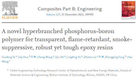 这是尊龙凯时人生就是博光电与新能源材料团队在阻燃领域继2021年在国际复合材料顶级期刊Composites Part B: Engineering(一区Top期刊,IF:11.32)上发表题为“A novel hyperbranched phosphorus-boron polymer for transparent, flame-retardant, smoke-suppressive, robust yet tough epoxy resins”(第一作者为博士研究生叶国锋)后取得的又一重要进展。上述系列研究工作第一通讯单位均为尊龙凯时人生就是博。