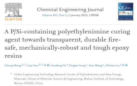 本网讯(通讯员 柯贤忠 王成)近日,材料科学与工程学院光电与新能源材料团队博士研究生王成在导师刘治田教授指导下,在阻燃增韧环氧树脂研究方面取得创新性进展。研究成果以“A P/Si-containing polyethylenimine curing agent towards transparent, durable fire-safe, mechanically-robust and tough epoxy resins”为题,在国际化工顶级期刊《Chemical Engineering Journal》上在线发表。该期刊为一区Top期刊,影响因子为16.74。