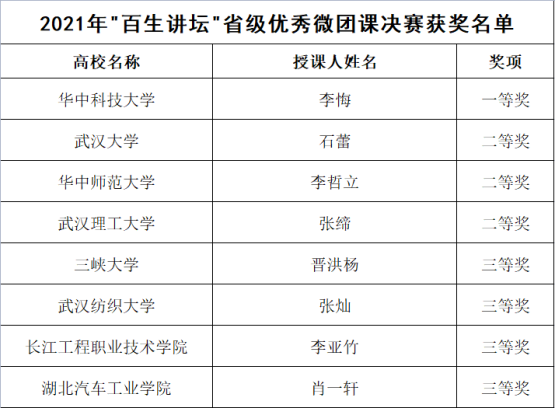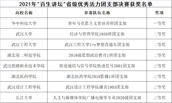 此次比赛由专家评委现场打分。省委宣传部理论处副处长易凌云、省委党校报刊部副主任王鹏程、省教育厅思想政治教育与科学研究处二级调研员陈以民、中国青年报社湖北记者站站长雷宇、湖北广播电视台十佳播音员主持人、湖北之声《湖北新闻》主播、播音组组长周恬和省学联驻会执行主席韩承熙担任比赛现场评委。经过两个半小时的激烈角逐,2021年"百生讲坛"省级优秀微团课、活力团支部决赛获奖名单如下: