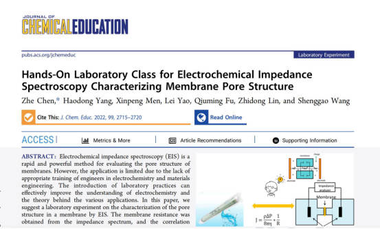 本网讯(通讯员 陈喆)日前,材料科学与工程学院教师陈喆以第一作者在国际著名期刊《Journal of Chemical Education》上发表教研论文《Hands-On Laboratory Class for Electrochemical Impedance Spectroscopy Characterizing Membrane Pore Structure》。该杂志是美国化学会于1924年创刊的、化学教研类国际顶级SCI期刊,据Web of science统计,近20年来(2003年至今)中国大陆作者在该期刊平均发文量占比约为0.021,也是继我校1999年以来再次在该杂志发表教研论文。