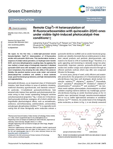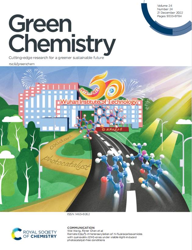 本网讯(通讯员 曾婕)近日,药物研究院陈芬儿院士团队汪伟副教授在国际顶级学术期刊《Green Chemistry》(IF=11.03) 发表了题为“Remote C(sp 3)-Hheteroarylation of N-fluorocarboxamides with quinoxalin-2(1 H)-onesunder visible-light-induced photocatalyst-free conditions” 的封面论文。尊龙凯时人生就是博为第一作者单位,汪伟副教授为主要通讯作者、陈芬儿院士为共同通讯作者,2020级博士研究生宣良明、2020级本科生杜如阳为共同第一作者。