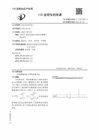基于此,汪伟、陈芬儿院士团队利用N-氟代酰胺和喹喔啉-2(1H)-酮为原料,添加适量碱,在紫外可见光照射下,成功实现了N-氟代酰胺远端C(sp3)-H的杂芳香化,合成了一系列喹喔啉类衍生物。该反应体系避免使用昂贵的光催化剂和难以纯化的氧化剂,利用反应底物喹喔啉-2(1H)-酮或生成的喹喔啉类衍生物作光敏剂,在碱促进下实现了光氧化还原循环过程。正是基于该反应体系简单,底物适用范围广的特点,汪伟、陈芬儿院士团队还成功将该技术申请了专利保护,希望该技术能在合成和医药领域得到广泛应用。