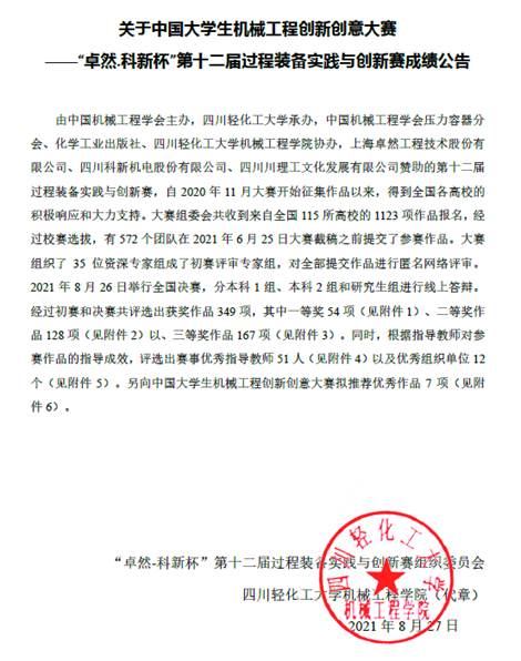 本网讯(通讯员 张聪 张靖宇)8月26日,由中国机械工程学会主办,四川轻化工大学承办的中国大学生机械工程创新创意大赛——“卓然?科新杯”第十二届过程装备实践与创新大赛全国总决赛圆满落下帷幕,我校学子斩获全国一等奖2项、全国二等奖5项,学校陈绪兵教授、林纬副教授、张尚盈副教授荣获“优秀指导教师”,学校荣获“优秀组织奖”。